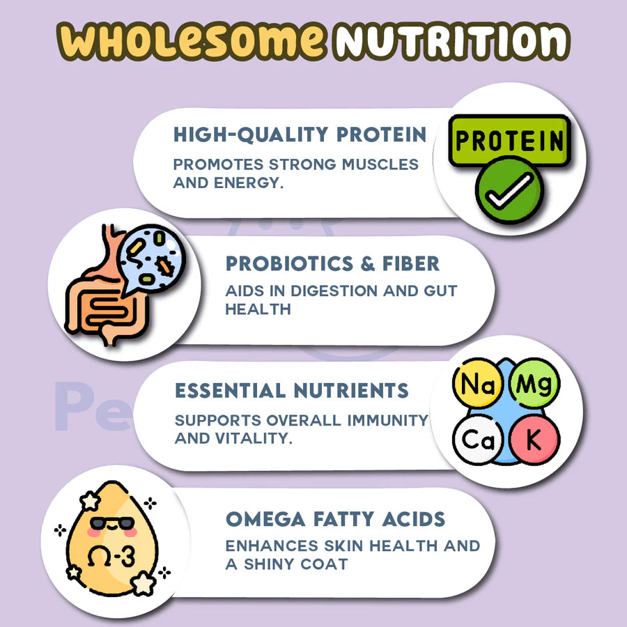 Dehydrated Whole Chicken, Fish Protein, Rice, Maire, Full Fat Soys, Soya Bean Meal, Chicken and Vegetable Cil, Cellulose, Potato Starch, Hydrolyzed Yeast (MOS), Natural Antioxidant